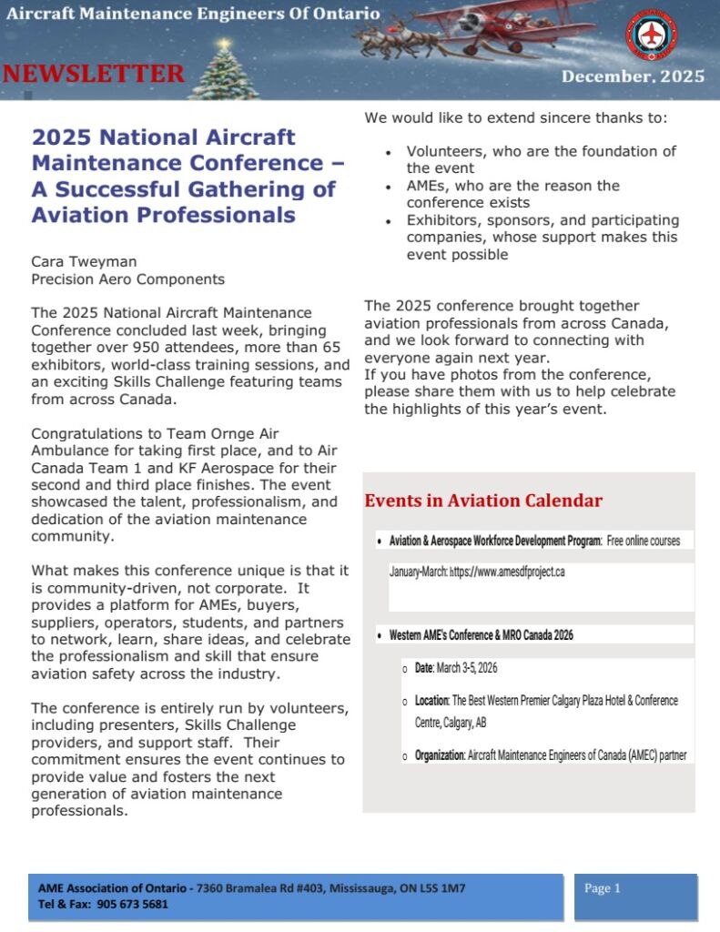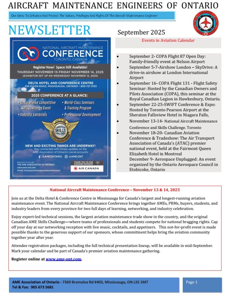 The Aircraft Maintenance Engineers Association of Ontario is a non-profit organization, run by a volunteer group of AMEs and non-AMEs. The purpose of the association is to maintain and enhance the standards of professionalism of the AME and the aircraft maintenance industry as a whole, and to promote the rights and privileges of the AME.